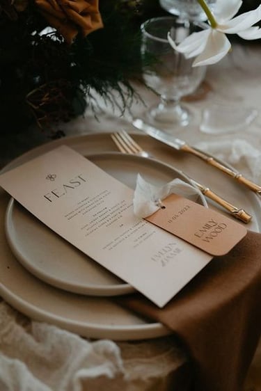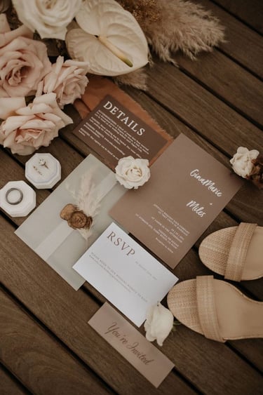 Os convites são o primeiro contato dos convidados com o tema do casamento. Aplique Mocha Mousse nos detalhes da papelaria, como envelopes, fontes ou texturas. Use combinações com acabamentos metálicos, como dourado ou cobre, para criar um ar de sofisticação.